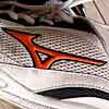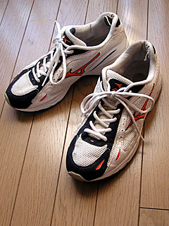 当時スニーカーは26.5cmを迷わず購入していたので、このシューズも試し履きもせず買ったのですが、さすがミズノは日本人向けなんでしょうね、ピッタリでした。で、途中クバトナエバを試したりもしましたが、気がつけば何の問題もなくジム履きとして2年6カ月も履き続けてしまいましたよ。さすがにアウトソールの外側が減ったし、踵部分の内側がぼろぼろになっていたので今回ナイキペガサス君を購入したこともあり、2004年の12月をもちまして現役引退をいたしました。完全引退の記念に廃棄前にグッズ紹介させていただきます。